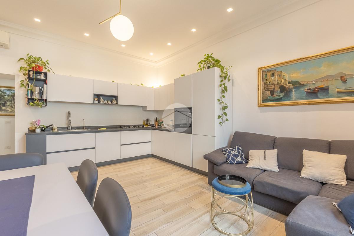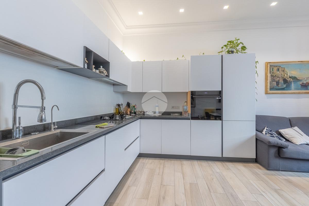 L’ingresso apre su un ampio salone con cucina a vista, uno spazio moderno, luminoso e accogliente, ideale per vivere appieno momenti di convivialità, all’insegna di comfort e funzionalità.